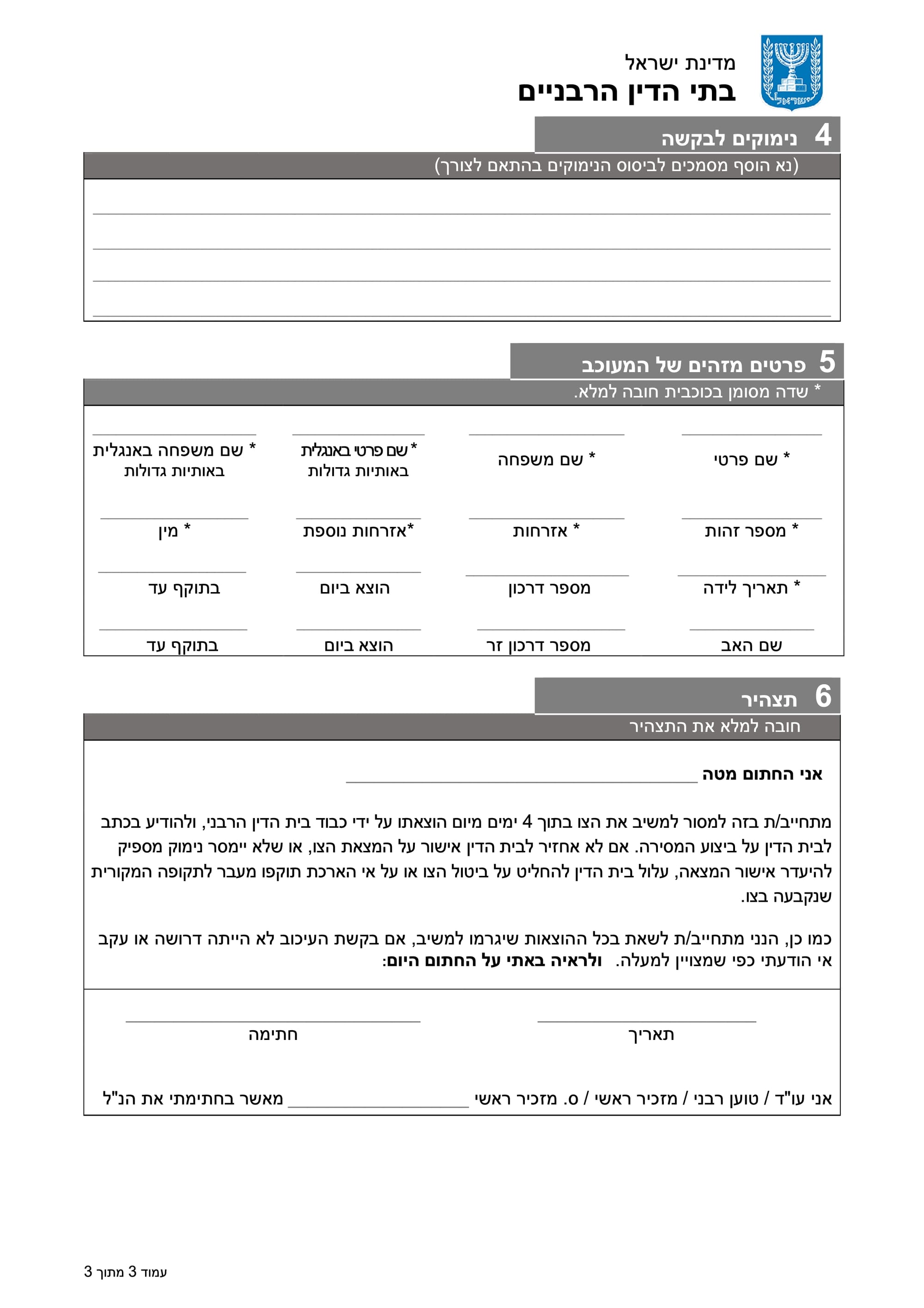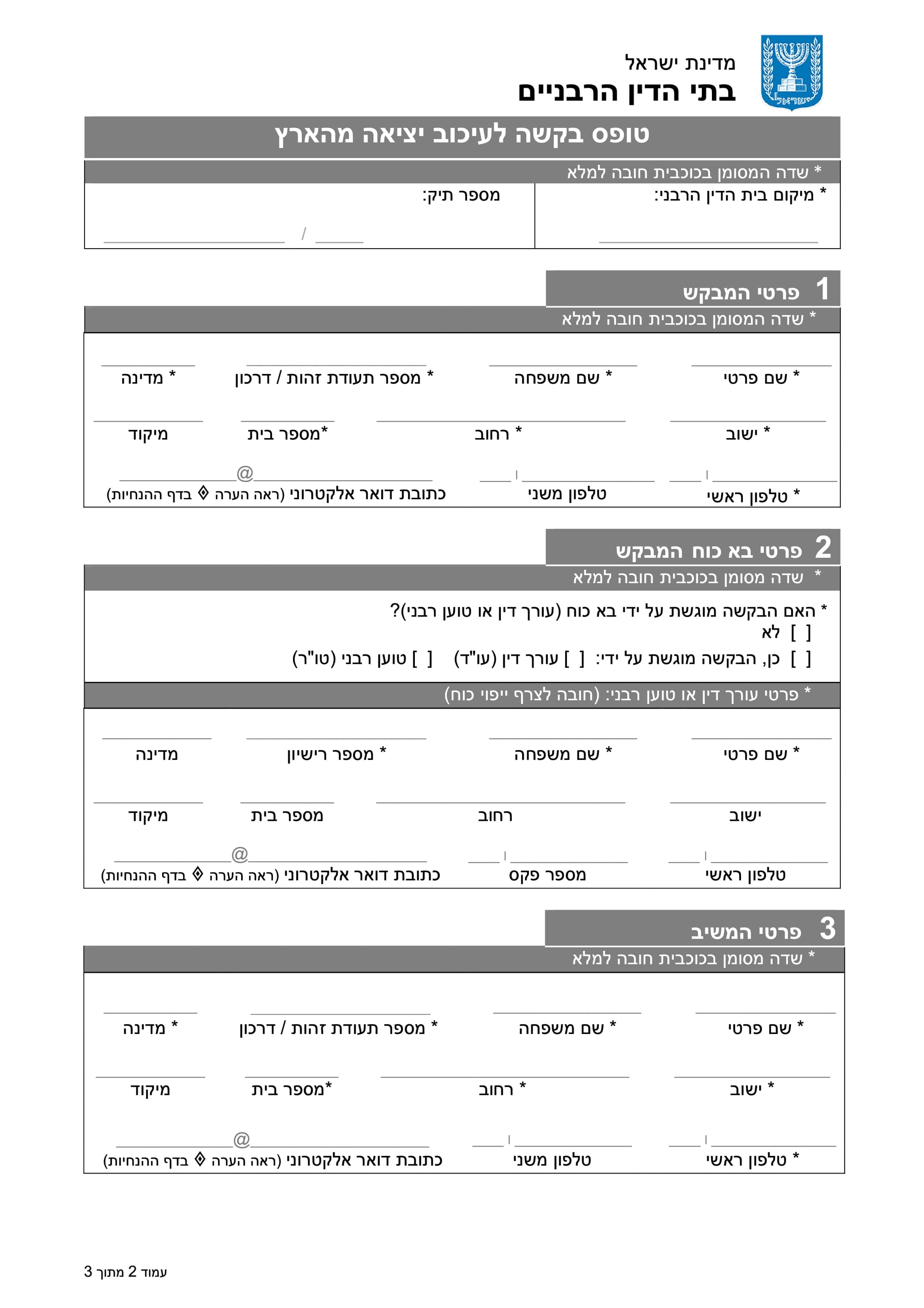 בקשה לעיכוב יצאה בבית הדין הרבני מוגשת כמעט באופן קבע בכל תיק לצורך הנוחות הבאנו את טופס הבקשה לעמוד זה מתוך אתר של בתי הדין הרבניים, ניתן גם ללחוץ על הקישור למעבר לאתר של בתי הדין הרבניים, או להוריד את הטופס המצורף בתחתית העמוד.