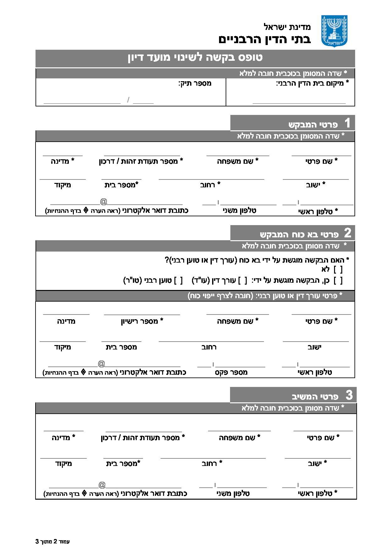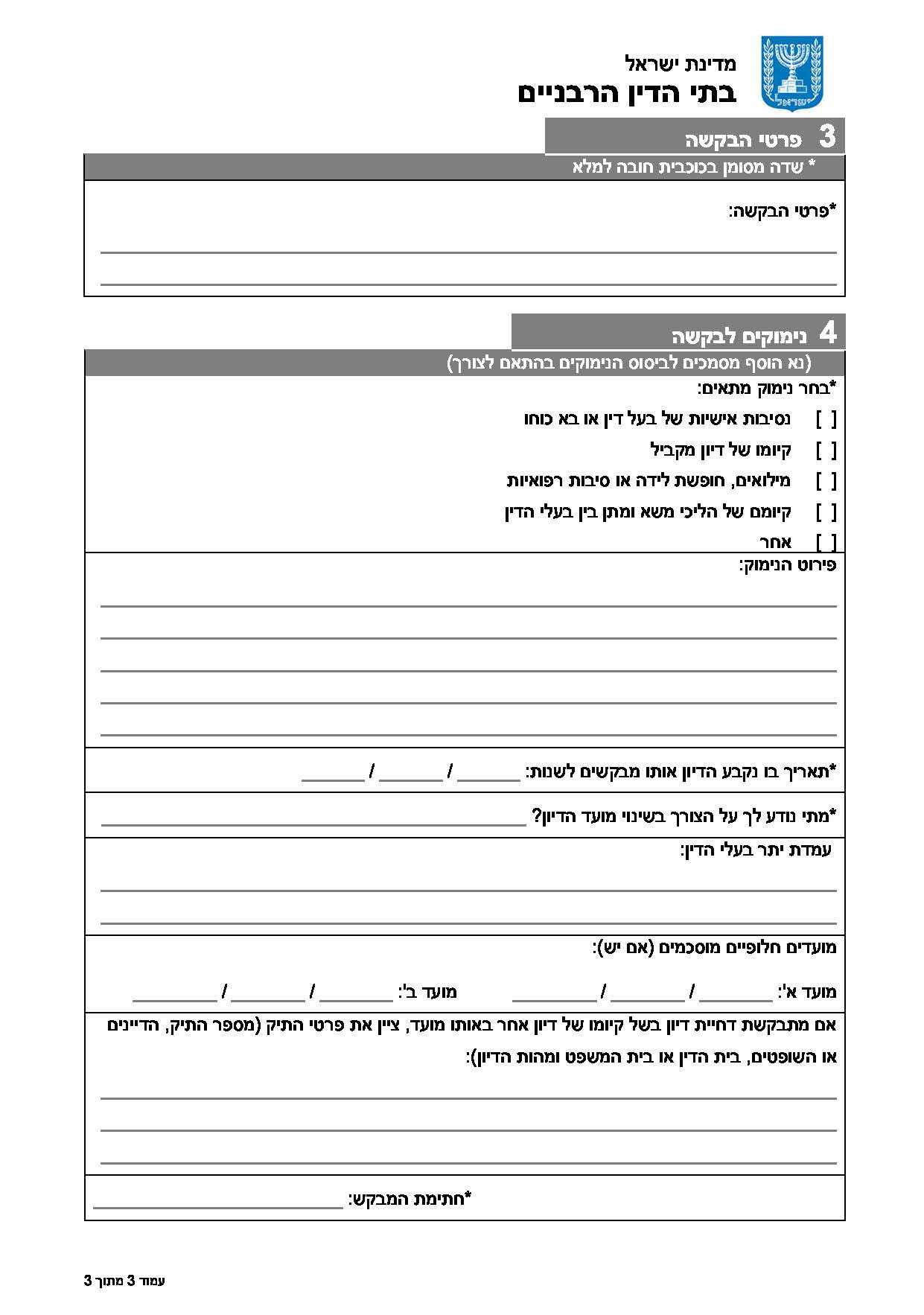 קודם הגשת הבקשה לבית הדין, על המבקש לפנות לקבלת עמדת הצד השני לבקשת הדחיה, ועמדה זו תצוין בבקשה. במקרים בהם ניתנה הסכמת הצד השני לדחייה יוגשו מועדים חלופיים מוסכמים.